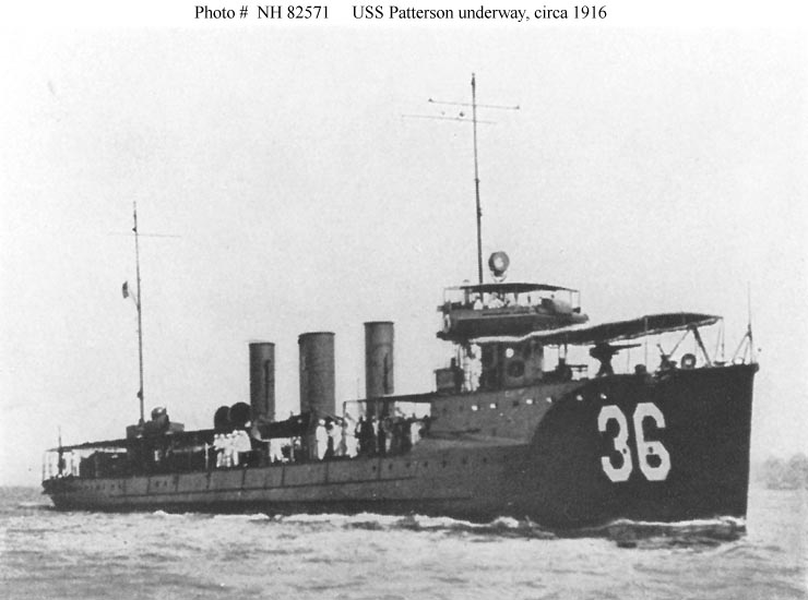 Photo #: NH 82571 USS Patterson (Destroyer # 36) Underway, circa 1916. Halftone reproduction, copied from the book "Our Navy in the War", by Lawrence Perry, 1922. U.S. Naval Historical Center Photograph. Online Image: 50KB; 740 x 550 pixels |
