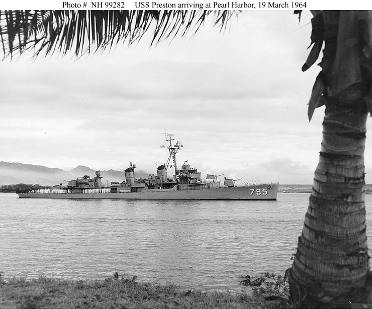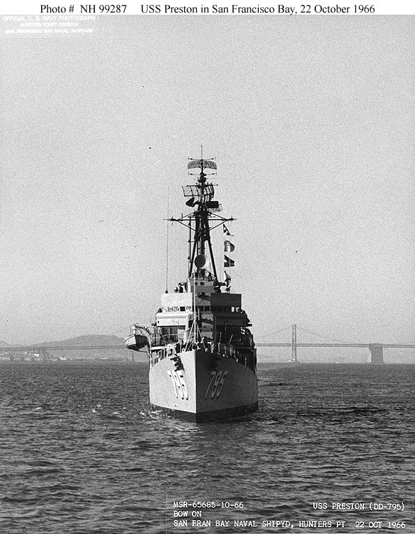 USS Preston (DD-795) in harbor, circa 1951. This image was received by the Naval Photographic Center in December 1959, but was probably taken when she recommissioned in 1951. Starboard broadside surface view. The ship still has a pole foremast, ten torpedo tubes, and World War II vintage radars. USS Preston (DD-795) underway in the Newport, Rhode Island, area, 8 October 1952. Photographed by Seaman E.L. Andrews Port broadside surface view. The ship has been refitted with a tripod foremast, newer radars and has had her midships torpedo tubes replaced with quad-mounted 40mm guns, but still has five 5"/38 guns. USS Preston (DD-795) underway, circa 1952-1954. This image was received by the Naval Photographic Center in December 1959, but was taken several years earlier. Starboard quarter low aerial view. USS Preston (DD-795) at Pearl Harbor, August 1961. Taken by PH3 Hill. Port broadside surface view, with palm trees framing the ship. USS Preston (DD-795) alongside USS Yorktown (CVS-10) to refuel, during Operation "Dominic", April 1962. Starboard bow surface view, with refueling hoses hanging in the upper left of the image. USS Preston (DD-795) pulls away from USS Norton Sound (AVM-1) after completing refueling during Operation "Dominic", April 1962. Starboard quarter surface view, with the ship somewhat backlighted against the sun. USS Preston (DD-795) alongside USS Constellation (CVA-64) to refuel. Photograph was received by the Naval Photographic Center in 1963. Port bow surface view, taken from on board Constellation, with shadows and some clutter in the foreground partially masking Preston. USS Preston (DD-795) underway off Oahu, Hawaii, 21 March 1964. Taken by PH2 Antoine. Port broadside aerial view. USS Preston (DD-795) in San Francisco Bay, California, 22 October 1966. Port bow surface view. As USN 1119051, but starboard bow (rather toward the broadside) surface view.