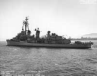 USS Preston, a 2050-ton modified Fletcher class destroyer, was built at San Pedro, California. Commissioned in March 1944, she arrived in the Pacific combat zone in July 1944, in time to participate in the campaign to recapture Guam from the Japanese. During the last four months of 1944 she supported the landings in the Palau Islands and screened aircraft carriers during the Battle of Leyte Gulf and a campaign of raids against enemy targets in the western Pacific and along the Asian mainland. Preston's carrier escort role continued in the first two months of 1945, as U.S. forces began the reconquest of Luzon, took Iwo Jima and raided the Japanese home islands. Beginning in March she covered the assault on the Ryukyus, providing gunfire support for troops ashore, patrolling against suicide boats, serving as a radar picket ship and escorting shipping in the vicinity of Okinawa.