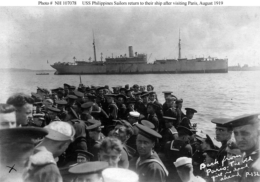 Photographed from a launch returning crew members to the ship after a sightseeing trip to Paris, France in August 1919.