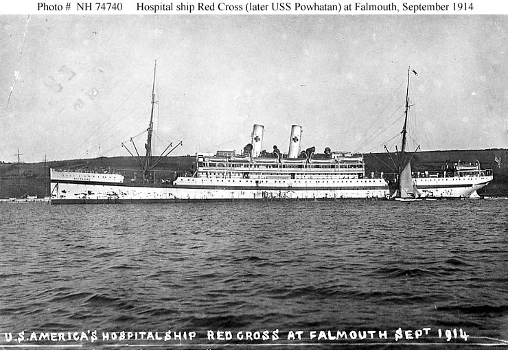 Photo #: NH 74740 S.S. Red Cross (American Hospital Ship, 1899) At Falmouth, England, September 1914. Originally the German passenger liner Hamburg, this ship was USS Powhatan (ID # 3013) in 1917-1919. Courtesy of Donald M. McPherson, 1972. U.S. Naval History and Heritage Command Photograph. Online Image: 107KB; 740 x 510 pixels |