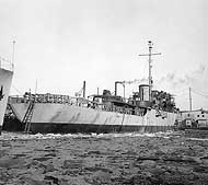 Photo #: 19-N-71139 USS Peoria (PF-67) Fitting out at the Leathem D. Smith Shipbuilding Company shipyard, Sturgeon Bay, Wisconsin, 12 January 1944. Note the ladder on the ice by the ship's stern. Photograph from the Bureau of Ships Collection in the U.S. National Archives. Online Image: 98KB; 690 x 640 pixels Reproductions of this image may also be available through the National Archives photographic reproduction system. |