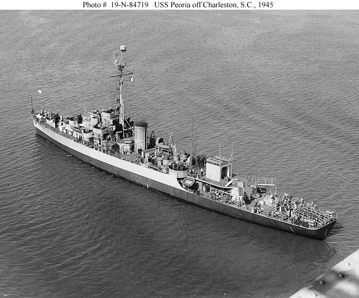 Photo #: 19-N-84720 USS Peoria (PF-67) Off Charleston, South Carolina, following modification as a weather station ship, circa June 1945. Photograph from the Bureau of Ships Collection in the U.S. National Archives. Online Image: 114KB; 600 x 765 pixels Reproductions of this image may also be available through the National Archives photographic reproduction system. |