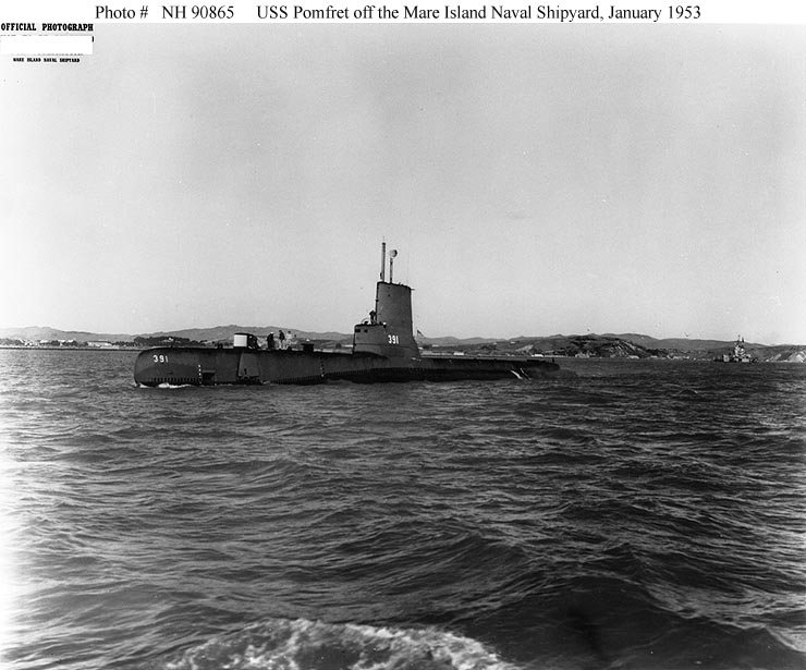 Photo #: 80-G-1042402 USS Pomfret (SS-391) Underway in 1951, prior to her "Guppy IIA" modernization. Official U.S. Navy Photograph. Online Image: 118KB; 740 x 615 pixels Reproductions of this image may also be available through the National Archives photographic reproduction system. |