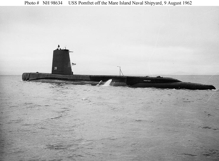 USS Pomfret (SS-391) off the Mare Island Navy Yard, California, 9 August 1962, after she had been fitted with a new "sail". Port bow surface view. As USN 1062029, but taken from directly off the submarine's stern.