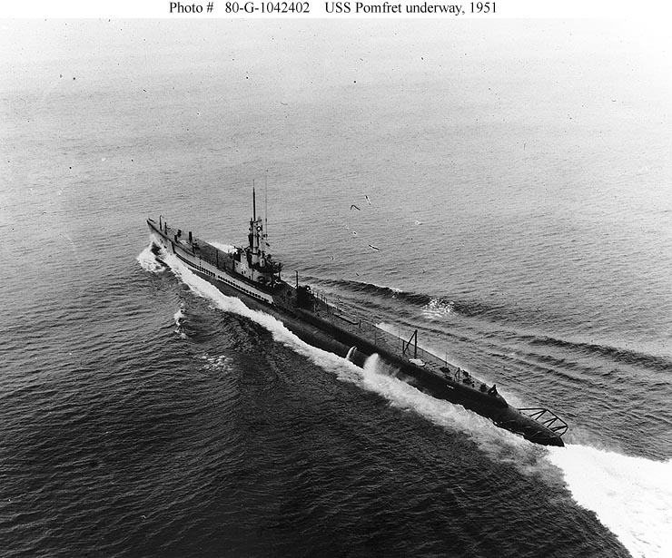 USS Pomfret, a 1526-ton Balao class submarine built at the Portsmouth Navy Yard, Kittery, Maine, was commissioned in February 1944. She joined the Pacific fleet several months later and made her first war patrol, in the waters off Japan, in June-August 1944. Though the submarine attacked three Japanese ships, including a battleship, none were hit. A second patrol, which took her into the Luzon Strait during September and October, produced the sinking of a Japanese transport. Returning to the Luzon Strait for her third combat cruise, Pomfret sank three more ships. Between late January and the end of the Pacific War in mid-August 1945, she made three patrols, during which she rescued several downed U.S. aviators (one in outer Tokyo Bay), shelled shore facilities and sank a number of floating mines.