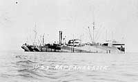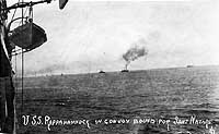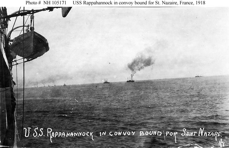 USS Rappahannock, a 17,000-ton (displacement) cargo and store ship, was built in Vegesack, Germany, in 1913 as the 6557 gross ton commercial freighter Pommern. Owned by the North German Lloyd shipping line, she sought refuge in a neutral U.S. port upon the outbreak of World War I and was seized when the United States entered the conflict in April 1917. Renamed Rappahannock and given registry ID # 1854, she was delivered to the Navy and commissined in December 1917. During the next year, the ship was employed by the Naval Overseas Transportation Service, making four voyages across the Atlantic in support of wartime operations, plus an additional round-trip between the U.S. and Europe in 1919.
