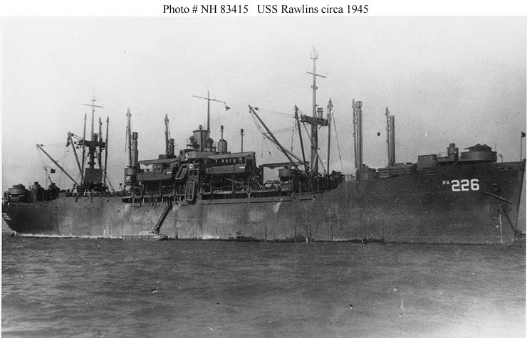 USS Rawlins, one of 117 Haskell-class attack transports, was built to a modified Victory ship design at Vancouver, Washington, and was commissioned in November 1944. After shakedown, she sailed from San Francisco in January 1945 to deliver cargo and replacement troops to New Caledonia. In February she joined forces training near Guadalcanal for the invasion of Okinawa. Rawlins sortied from Ulithi in late March with the assault force and arrived off the island on D-Day at the beginning of April. After five days off Okinawa the ship retired first to Saipan and then to San Francisco. She returned to Okinawa in July with reinforcements, and in early August carried fresh troops to the Philippines from the West Coast.
