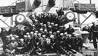 Photo #: NH 101126 USS Rhode Island (Battleship # 17) Men of the battleship's First Division pose before the forward 12" & 8" superposed gun turret, circa 1913. Note goat in front center. Photographed by Sargent. From the album of Francis Sargent; Courtesy of Commander John Condon, 1986. U.S. Naval Historical Center Photograph. Online Image: 106KB; 740 x 450 pixels |