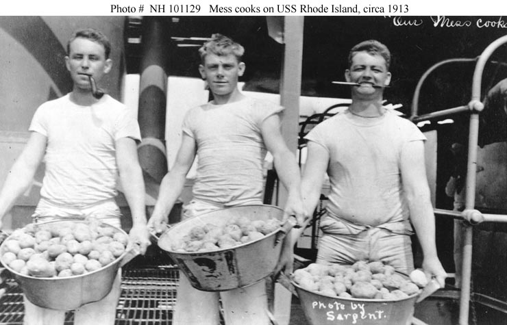 Photo #: NH 101129 USS Rhode Island (Battleship # 17) "Our Mess cooks": Three crewmen prepare to peel potatos, circa 1913. Photographed by Sargent. From the album of Francis Sargent; Courtesy of Commander John Condon, 1986. U.S. Naval Historical Center Photograph. Online Image: 66KB; 740 x 475 pixels |