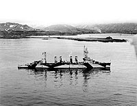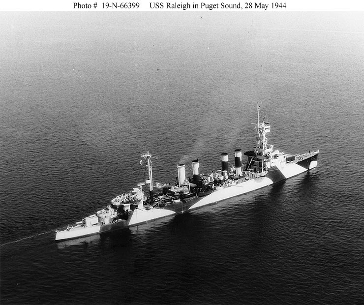 Photo #: NH 97394 USS Raleigh (CL-7) In Massacre Bay, Attu Island, Aleutians, 6 September 1944. The ship is painted in camouflage Measure 32, Design 1d. Official U.S. Navy Photograph, from the collections of the Naval Historical Center. Online Image: 89KB; 740 x 600 pixels |