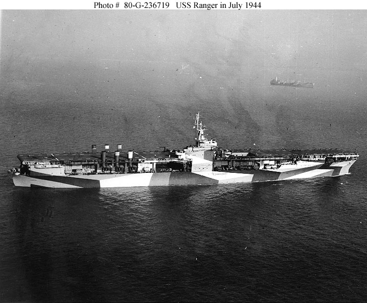 Photo #: 80-G-236719 USS Ranger (CV-4) Photographed from a Naval Air Station, Hampton Roads, Virginia, aircraft on 6 July 1944. Note her camoflage paint scheme. Official U.S. Navy Photograph, now in the collections of the National Archives. Online Image: 98KB; 740 x 610 pixels Reproductions of this image may also be available through the National Archives photographic reproduction system. |