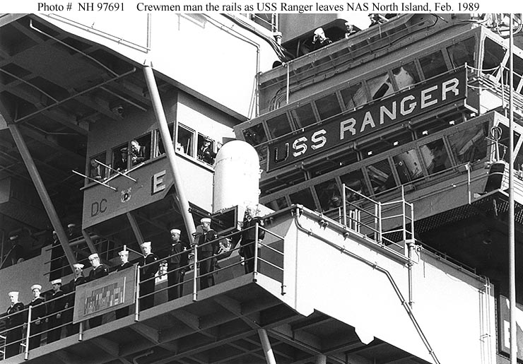 Photo #: NH 97691 USS Ranger (CV-61) Crewmembers man the rails by the carrier's island, as she departs Naval Air Station, North Island, California, on 24 February 1989 to begin a western Pacific deployment. Photographed by PH1 Michael D.P. Flynn. Official U.S. Navy Photograph, from the collections of the Naval Historical Center. Online Image: 108KB; 740 x 515 pixels |