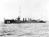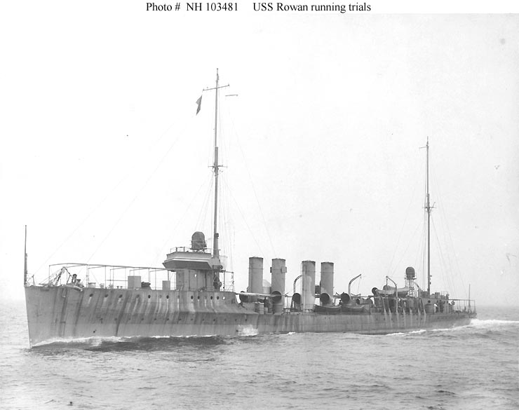 USS Rowan, a 1111-ton Sampson class destroyer built at Quincy, Massachusetts, was commissioned in August 1916 and performed her initial active service in East Coast and Caribbean waters. In May 1917, two months after the United States entered World War I, Rowan crossed the Atlantic to begin anti-submarine patrols and escort work out of Queenstown, Ireland. While so employed, she attacked and apparently damaged a German U-boat in late May 1918. Leaving Ireland in December 1918, the destroyer returned to the U.S. to begin more than two years of intermittant operations along the Atlantic coast and in the Caribbean. When the Navy implemented its hull number system in July 1920, Rowan was designated DD-64. She was placed out of commission in mid-June 1922. Following nearly a decade and a half in "Red Lead Row" at the Philadelphia Navy Yard, USS Rowan was stricken from the Navy list in early 1936 and, in April 1939, sold for scrapping.