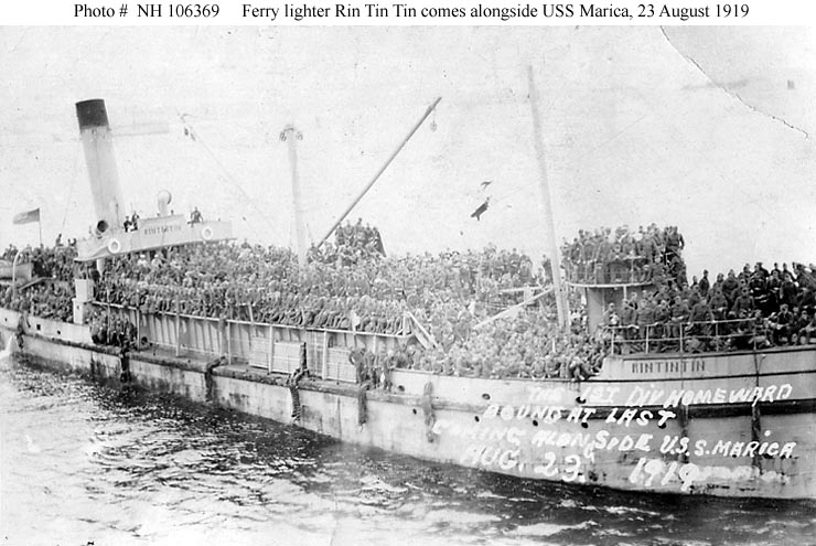 Photo #: NH 106369 Ferry Lighter Rin Tin Tin Coming alongside USS Marica (ID # 4031) to transfer homeward bound troops of the First Division, in Brest Harbor, France on 23 August 1919. The original image is printed on post card ("AZO") stock. Donation of Dr. Mark Kulikowski, 2008. U.S. Naval History and Heritage Command Photograph. Online Image: 87KB; 740 x 495 pixels |