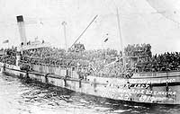 Photo #: NH 106021 Ferry Lighter RinTinTin Alongside a transport in Brest harbor, France, 1919. She is delivering troops for transportation home to the United States. The transport may be USS Seattle (Armored Cruiser # 11). The original photograph is printed on post card ("AZO") stock. Donation of Dr. Mark Kulikowski, 2008. U.S. Naval History and Heritage Command Photograph. Online Image: 65KB; 425 x 765 pixels |