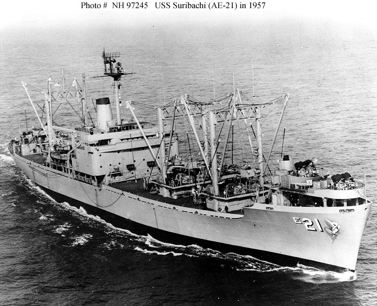 USS Suribachi, a 17,450-ton ammunition ship, was built at Sparrows Point, Maryland. Commissioned in November 1956, she was assigned to the Atlantic Fleet, frequently deploying to the Mediterranean to provide ammunition and other supplies to ships operating there. In 1963, she was modernized with new "FAST" underway replenishment gear and a helicopter deck, both of which enabled her to supply cargo more rapidly and in a greater variety of conditions. Suribachi made one deployment to the Far East in 1972-73 to support Vietnam operations, and in the Summer of 1990 she steamed to the Persian Gulf area to participate in Operation "Desert Shield". She decommissioned in December 1994 and was stricken from the Naval Vessel Register two years later. At the present time she is still in Navy custody, at the Naval Inactive Ship Maintenance Facility, Philadelphia, Pennsylvania.