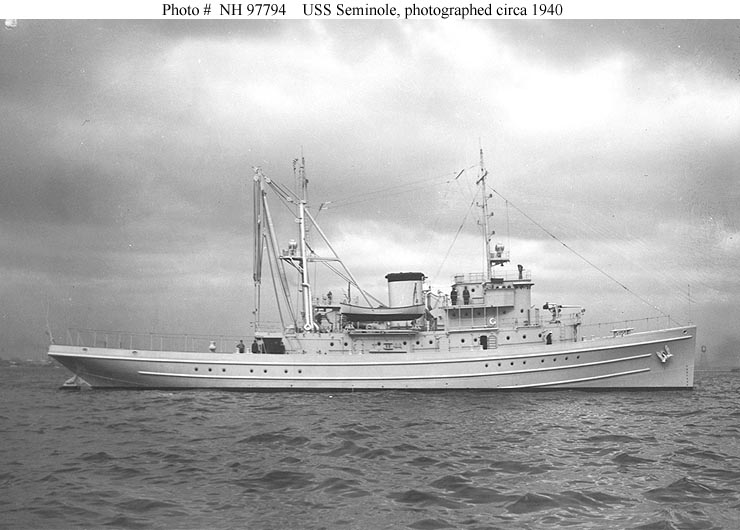 USS Seminole, a 1500-ton Navajo class ocean-going tug, was built at Staten Island, New York. She was commissioned in March 1940 and transferred to the Pacific after her east coast shakedown cruise. During the next two years, as tensions in the Far East gradually grew and exploded into war, Seminole performed towing and salvage operations in the west coast and Hawaii areas. Among the ships she assisted were the Army Transport President Taylor, Navy patrol craft YP-108 and USS Vireo (AT-144).