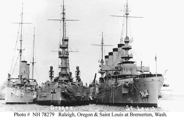 Photo #: NH 78279 USS Raleigh (C-8) USS Oregon (BB-3) and USS Saint Louis (C-20) Moored together at the Puget Sound Navy Yard, Bremerton, Washington, circa 1913. Saint Louis is being repainted. Courtesy of Donald M. McPherson, 1973. U.S. Naval Historical Center Photograph. Online Image: 60KB; 740 x 475 pixels |