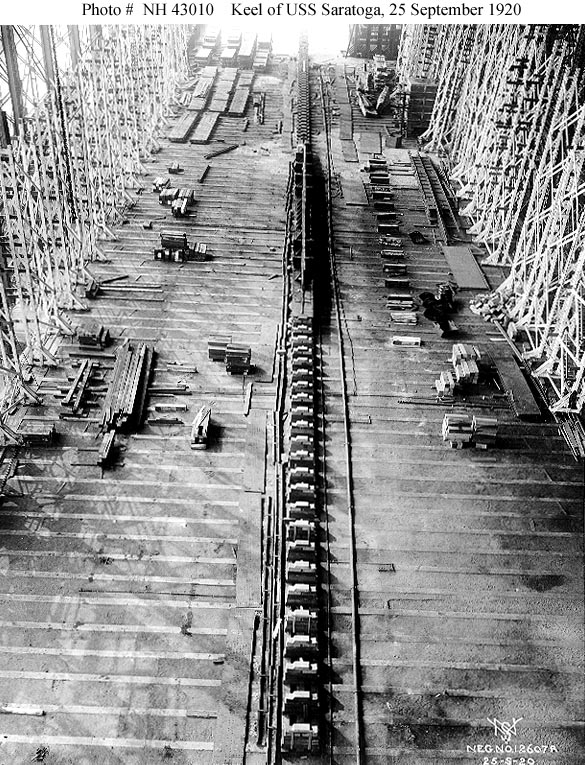 Photo #: NH 43010 USS Saratoga (CC-3) Under construction at the New York Shipbuilding Company shipyard, Camden, New Jersey, 25 September 1920, immediately after the keel was laid. U.S. Naval History and Heritage Command Photograph. Online Image: 182KB; 585 x 765 pixels |