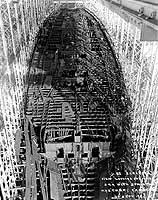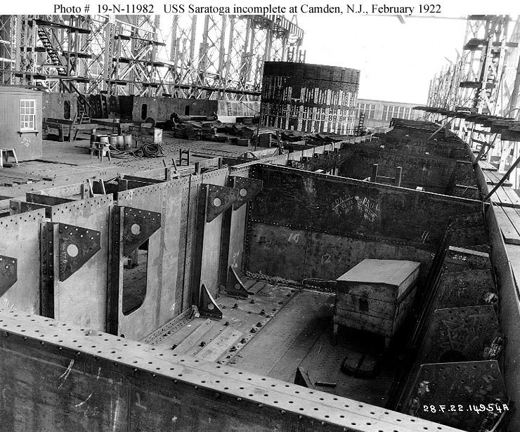 Photo #: 19-N-11982 USS Saratoga (CC-3) Under construction at the New York Shipbuilding Company shipyard, Camden, New Jersey, 28 February 1922. View was taken from the starboard side of the third deck, amidships, looking forward. Photograph from the Bureau of Ships Collection in the U.S. National Archives. Online Image: 158KB; 740 x 615 pixels Reproductions of this image may also be available through the National Archives photographic reproduction system. |