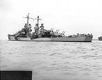 USS San Juan, a 6000-ton Atlanta class light cruiser built at Quincy, Massachusetts, was commissioned at the end of February 1942. In June of that year, following shakedown in the western Atlantic, she went to the Pacific to join the war against Japan. She arrived in the south Pacific in July, in time to particiate in the initial phases of the prolonged and bitter Guadalcanal Campaign. The cruiser provided gunfire support when U.S. Marines landed on Guadalcanal and Tulagi on 7 August, and served thereafter mainly as an escort for U.S. aircraft carriers. In October 1942, she raided Japanese shipping in the Gilbert Islands and served in the screen during the Battle of the Santa Cruz Islands. San Juan was hit by a Japanese bomb during the latter action, requiring her to steam to Australia for repairs.