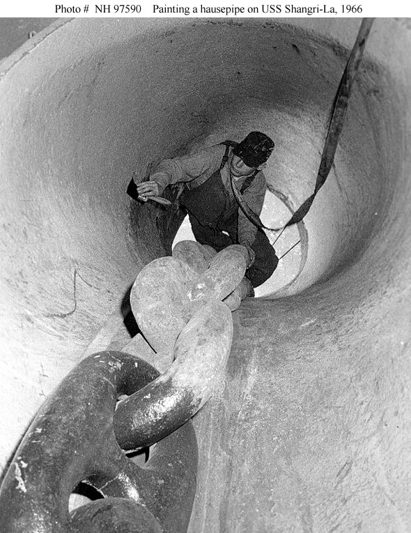 Photo #: NH 97590 USS Shangri-La (CVA-38) A crewman paints one of the carrier's hausepipes, while supporting himself on anchor chain, 4 May 1966. Photographed by PH2 Jack Weir. Note the position of this man's safety line, passing under his chin. This is not healthy! Official U.S. Navy Photograph, from the collections of the Naval Historical Center. Online Image: 126KB; 590 x 765 pixels |