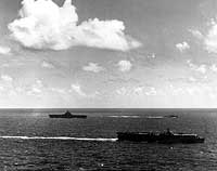 Photo #: 80-G-238786 USS San Jacinto (CVL-30) -- right foreground Steaming in formation with USS Lexington (CV-16) and a DD-348 class destroyer, during pre-invasion operations in the Marianas area, 13 June 1944. Both carriers belonged to Task Group 58.3. Official U.S. Navy Photograph, now in the collections of the National Archives. Online Image: 90KB; 740 x 610 pixels Reproductions of this image may also be available through the National Archives photographic reproduction system. |