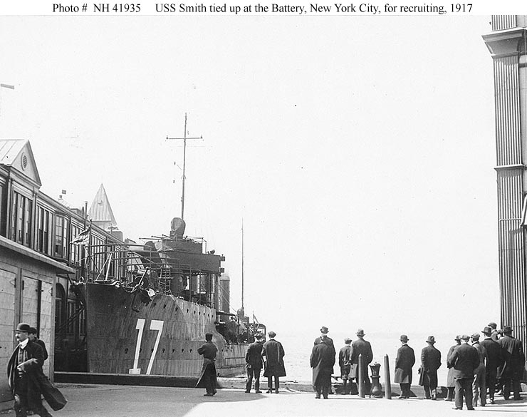 Photo #: NH 41935 USS Smith (Destroyer # 17) Tied up at the Battery, New York City, "to hurry the recruiting", circa February-March 1917. Photographed by Kadel & Herbert, New York. U.S. Naval Historical Center Photograph. Online Image: 73KB; 740 x 585 pixels |