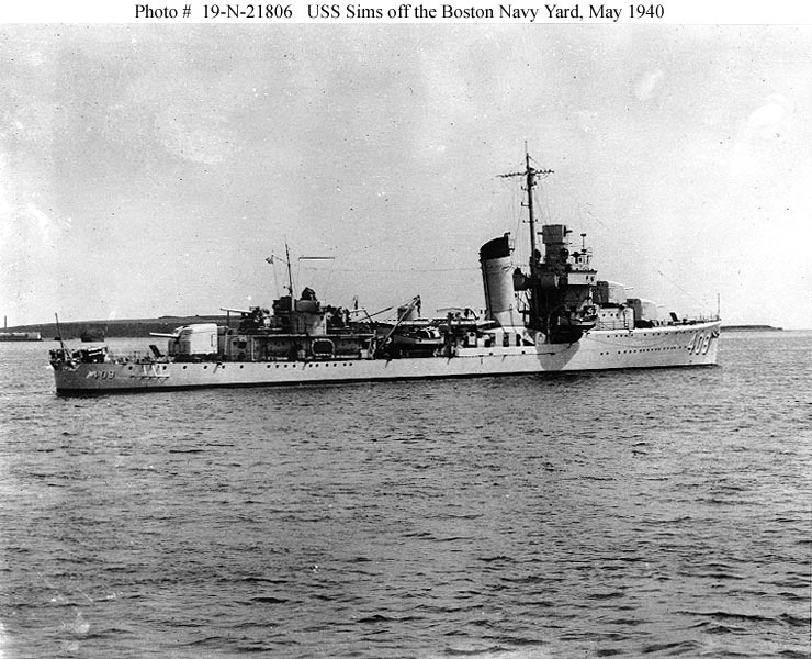 Photo #: 19-N-21804 USS Sims (DD-409) Off the Boston Navy Yard, Charlestown, Massachusetts, 9 May 1940. Photograph from the Bureau of Ships Collection in the U.S. National Archives. Online Image: 99KB; 740 x 585 pixels Reproductions of this image may also be available through the National Archives photographic reproduction system. |