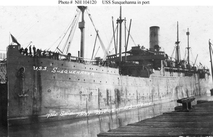 Photo #: NH 104120 USS Susquehanna (ID # 3016) In port, 1919. The original image was printed on postal card ("AZO") stock. Donation of Dr. Mark Kulikowski, 2006. U.S. Naval History and Heritage Command Photograph. Online Image: 66KB; 740 x 475 pixels |