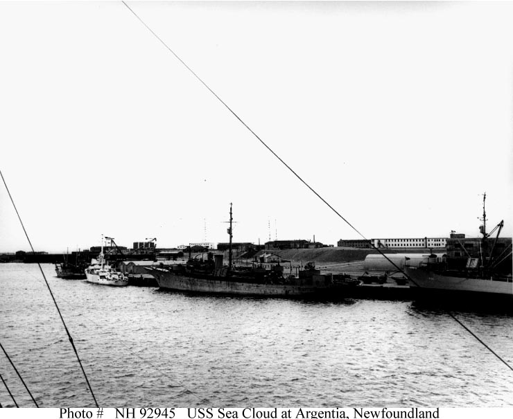 Photo #: NH 92945 USS Sea Cloud (IX-99) At Argentia, Newfoundland, in July 1944, while serving with a Coast Guard crew on weather reporting duties. A net tender (AN) is at left, with a light-painted submarine chaser (PCE) just forward of Sea Cloud. USS Pontiac (AF-20) is at the extreme right. U.S. Naval Historical Center Photograph. Online Image: 65KB; 740 x 605 pixels |