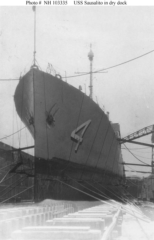 USS Sausalito (PF-4) entering the floading drydock ARD-5 at Dutch Harbor, Alaska, 10 October 1944. Bow-on view of the ship, seen from the port wing wall of the drydock. Mountains are visible in the background on what appears to have been a very overcast day. Reproductions of this image should be available through the National Archives photographic reproduction system for pictures not held by the Naval Historical Center. The image listed above is NOT in the Naval Historical Center's collections. DO NOT try to obtain it using the procedures described in our page "How to Obtain Photographic Reproductions". |