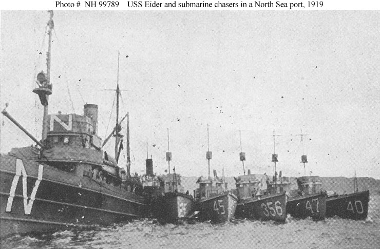 Photo #: NH 45258 U.S. Navy Minesweepers and Submarine Chasers at Stavanger, Norway, 1919 While taking part in clearing the North Sea mine barrage, "The fleet put in(to) Stavanger, a bustling town in Norway, made prosperous by the war." (quoted from the original 1919 vintage caption). USS Woodcock (Minesweeper # 14) is in the foreground. In the left background are (from front to rear): USS SC-356, USS SC-40, USS Eider (Minesweeper # 17), USS Sanderling (Minesweeper # 37) - probable identification, USS Auk (Minesweeper # 38) and an unidentified minesweeper. U.S. Naval Historical Center Photograph. Online Image: 70KB; 740 x 550 pixels |