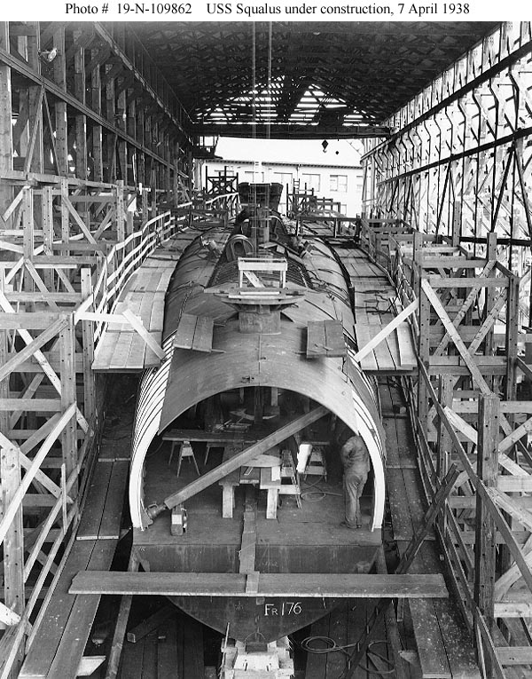 Photo #: 19-N-109862 USS Squalus (SS-192) Under construction on the building ways at the Portsmouth Navy Yard, Kittery, Maine, 7 April 1938. View looks forward, with frame 176 lower bulkhead in the foreground. Photograph from the Bureau of Ships Collection in the U.S. National Archives. Online Image: 153KB; 600 x 765 pixels Reproductions of this image may also be available through the National Archives photographic reproduction system. |