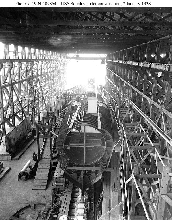 Photo #: 19-N-109861 USS Squalus (SS-192) Under construction on the building ways at the Portsmouth Navy Yard, Kittery, Maine, 7 April 1938. View looks aft, with forward torpedo tube supporting structure in the foreground. Photograph from the Bureau of Ships Collection in the U.S. National Archives. Online Image: 144KB; 600 x 765 pixels Reproductions of this image may also be available through the National Archives photographic reproduction system. |