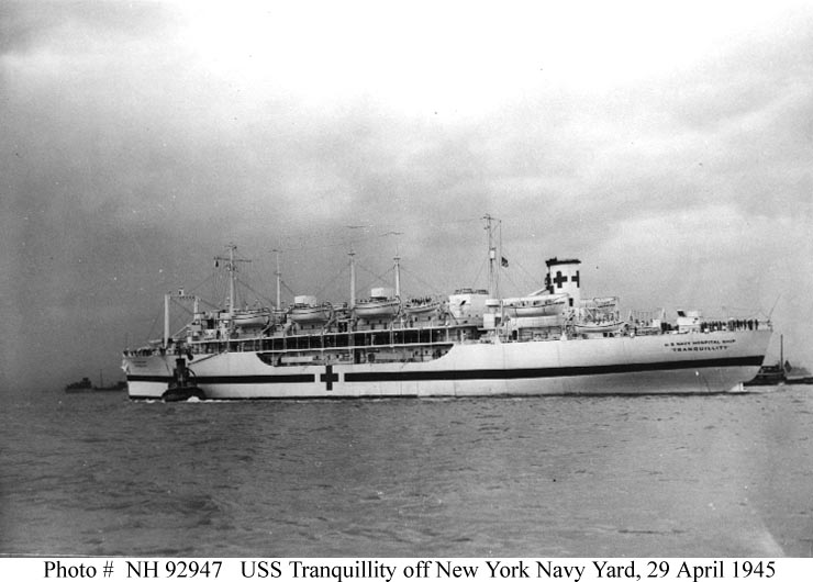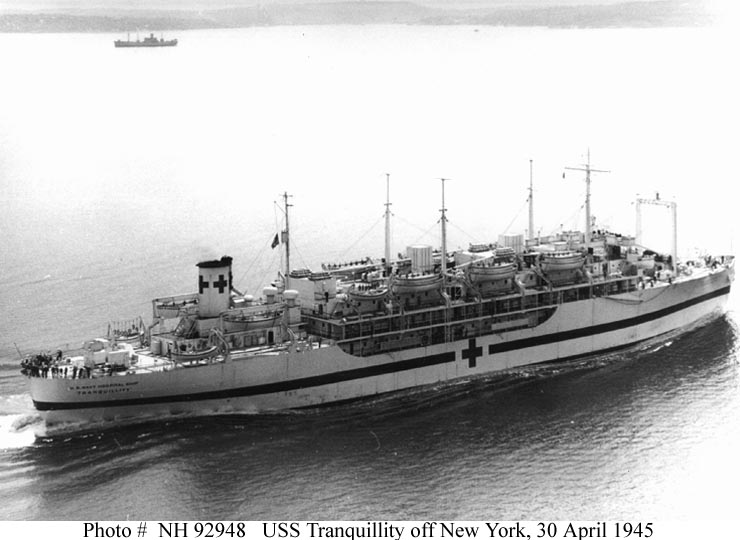 Photo #: NH 92948 USS Tranquillity (AH-14) Off New York City, 30 April 1945. Courtesy of the U.S. Naval Institute, collection of James C. Fahey. U.S. Naval Historical Center Photograph. Online Image: 61KB; 740 x 540 pixels |