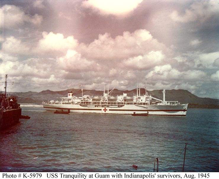 Photo #: 80-G-K-5979 (Color) Loss of USS Indianapolis, July 1945 USS Tranquillity (AH-14) arrives at Guam, carrying survivors of USS Indianapolis (CA-35), 8 August 1945. Official U.S. Navy Photograph, now in the collections of the U.S. National Archives. Note on color quality: The original ANSCO transparency has degraded color, with purples and greens predominating. This has been somewhat corrected in this reproduction. Online Image: 78KB; 740 x 605 pixels Reproductions of this image may also be available through the National Archives photographic reproduction system. |