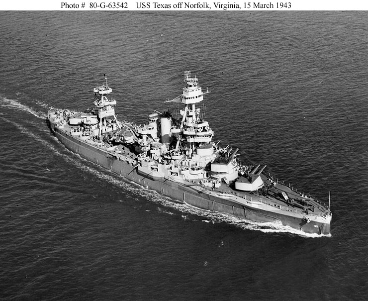 Photo #: 80-G-63542 USS Texas (BB-35) Underway off Norfolk, Virginia, 15 March 1943, with her main battery gun turrets trained to port. Official U.S. Navy Photograph, now in the collections of the National Archives. Online Image: 117KB; 740 x 605 pixels Reproductions of this image may also be available through the National Archives photographic reproduction system. |