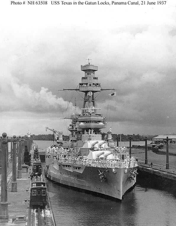 Photo #: NH 63508 USS Texas (BB-35) In the Gatun Locks, while transiting the Panama Canal en route to the U.S. east coast, 21 June 1937. U.S. Naval Historical Center Photograph. Online Image: 111KB; 595 x 765 pixels |