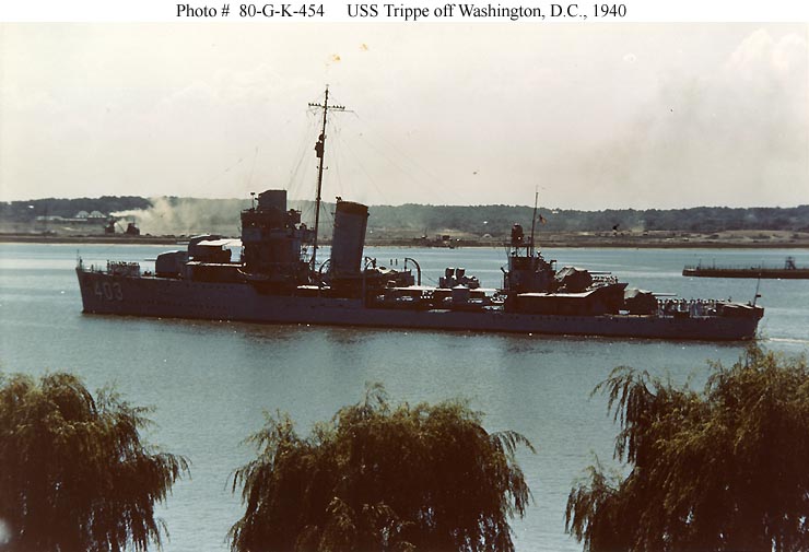 Photo #: 80-G-415474 USS Trippe (DD-403) Steaming down the Anacostia River, after a visit to the Washington Navy Yard, D.C., 18 July 1940. Photographed from the Naval Air Station, Anacostia, with Hains point park in the background. Official U.S. Navy Photograph, now in the collections of the National Archives. Online Image: 95KB; 740 x 600 pixels Reproductions of this image may also be available through the National Archives photographic reproduction system. |