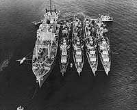 Photo #: NH 82518 USS Klondike (AR-22) In Subic Bay, Philippines, on 1 November 1963. The destroyers alongside, all "FRAM II" types of Destroyer Squadron 15, are: (from inboard to outboard): USS Taussig (DD-746); USS John A. Bole (DD-755); USS Lofberg (DD-759); and USS John W. Thomason (DD-760). Official U.S. Navy Photograph, from the collections of the Naval Historical Center. Online Image: 123KB; 740 x 620 pixels |