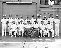 Photo #: NH 98996 USS Taussig (DD-746) Ship's officers posed on her helicopter deck, circa 1970. Note the flag, featuring a tiger emblem. This photograph was received from USS Taussig prior to February 1971. Official U.S. Navy Photograph, from the collections of the Naval Historical Center. Online Image: 121KB; 740 x 610 pixels |