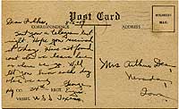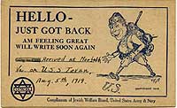 Photo #: NH 104078-A-KN (color) Jewish Welfare Board Post Card for Returning Troops, 1919 Reverse side of a card used by returning troops to report their arrival in the United States from Europe. This example was sent on 6 August 1919, reporting the arrival of a member of the 34th Engineer Regiment at Norfolk, Virginia, on USS Texan (ID # 1354). It was mailed to his mother, Mrs. Arthur Dean of Nevada, Iowa. The front side of this card is seen in Photo # NH 104078-KN. Donation of Dr. Mark Kulikowski, 2006. U.S. Naval History and Heritage Command Photograph. Online Image: 97KB; 740 x 475 pixels |