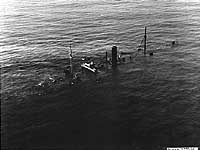 Photo #: 80-G-177196 S.S. Tiger (American Tanker, 1917) Sinking in shallow water near Cape Henry, Virginia, circa 2 April 1942. Tiger, originally built as a freighter, was torpedoed by the German submarine U-754 just after midnight on 1 April 1942, after she had reduced speed to pick up a pilot before entering Chesapeake Bay. She sank a few days later, while under tow. This ship served as USS Tiger (ID # 1640) in 1918-1919. Official U.S. Navy Photograph, now in the collections of the National Archives. Online Image: 94KB; 740 x 580 pixels Reproductions of this image may also be available through the National Archives photographic reproduction system. |