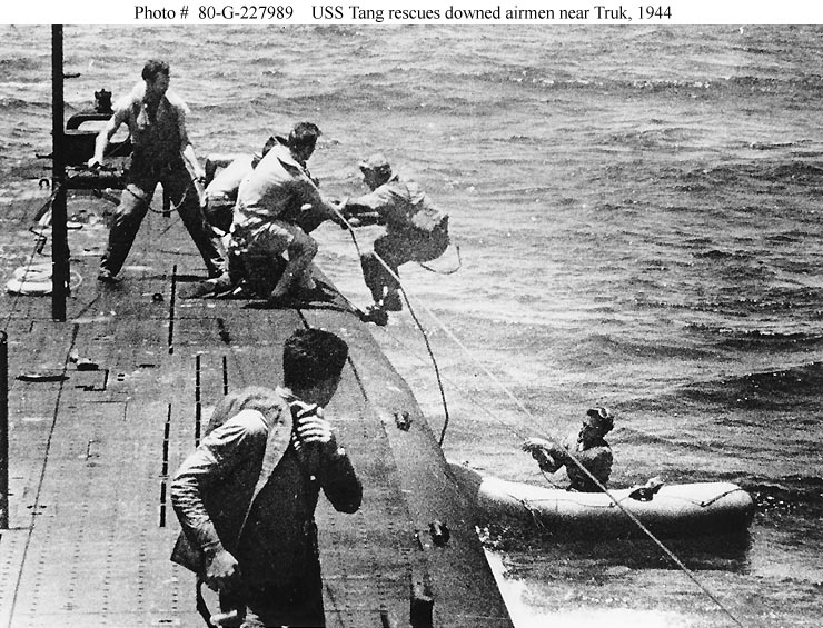 Photo #: 80-G-227989 USS Tang (SS-306) Takes aboard aircrewmen of downed aircraft and of a USS North Carolina (BB-55) OS2U floatplane that had landed to rescue them, off Truk on 1 May 1944. Tang was serving as lifeguard submarine during the 29 April-1 May carrier strikes on Truk. Official U.S. Navy Photograph, now in the collections of the National Archives. Online Image: 142KB; 740 x 565 pixels Reproductions of this image may also be available through the National Archives photographic reproduction system. |