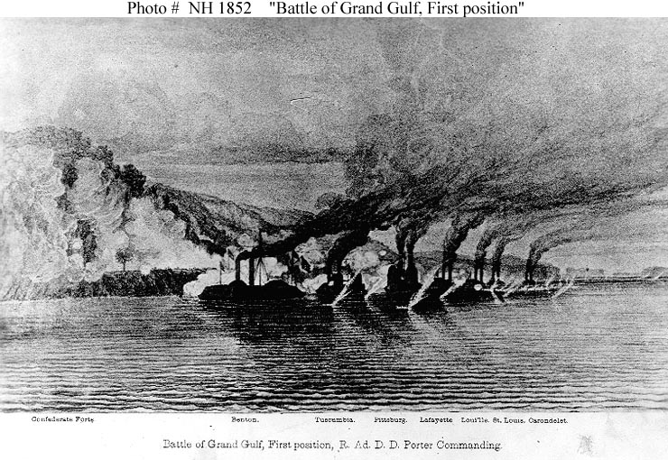Photo #: NH 1852 "Battle of Grand Gulf, First position, R. Ad. D.D. Porter Commanding" Engraving published in Rear Admiral Henry Walke's "Naval Scenes and Reminiscences of the Civil War in the United States ..." (1877), depicting U.S. Navy ironclads engaging Confederate batteries at Grand Gulf, Mississippi, 29 April 1863. U.S. ships present, as identified on the print, are (from left-center to right): Benton, Tuscumbia, Pittsburg, Lafayette, Louisville, Saint Louis and Carondelet. U.S. Naval Historical Center Photograph. Online Image: 152KB; 740 x 510 pixels |