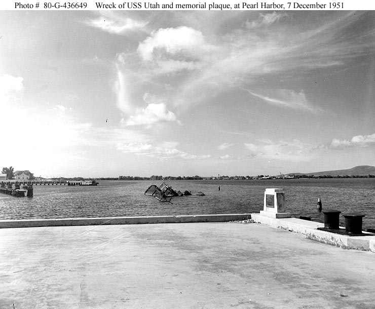 Photo #: 80-G-484354 USS Utah (AG-16) Memorial plaque mounted on the ship's wreck, off the west side of Ford Island, Pearl Harbor. Photographed on 9 December 1950. The plaque's inscription reads: "In Memory - Officers and Men - USS Utah - Lost in Action - 7 December 1941". Official U.S. Navy Photograph, now in the collections of the National Archives. Online Image: 112KB; 740 x 610 pixels Reproductions of this image may also be available through the National Archives photographic reproduction system. |