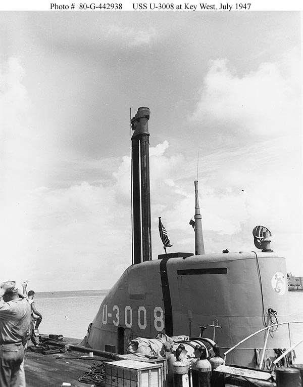 Photo #: 80-G-442938 USS U-3008 (ex-German submarine U-3008) View of the submarine's conning tower, with her snorkel raised. Taken at Key West Naval Station, Florida, 25 July 1947. Note her insignia painted on the front of the conning tower. Official U.S. Navy Photograph, now in the collections of the National Archives. Online Image: 65KB; 595 x 765 pixels Reproductions of this image may also be available through the National Archives photographic reproduction system. |