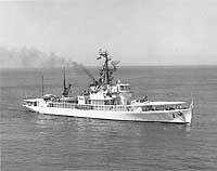 Photo #: NH 97992 USS Valcour (AGF-1) Departing Hampton Roads, Virginia, on 18 April 1966 for her new home port of Bahrain. This, her sixteenth Middle East deployment, lasted until she returned to Norfolk in 1972 to decommission. Naval Historical Center Photograph. Online Image: 76KB; 740 x 615 pixels |